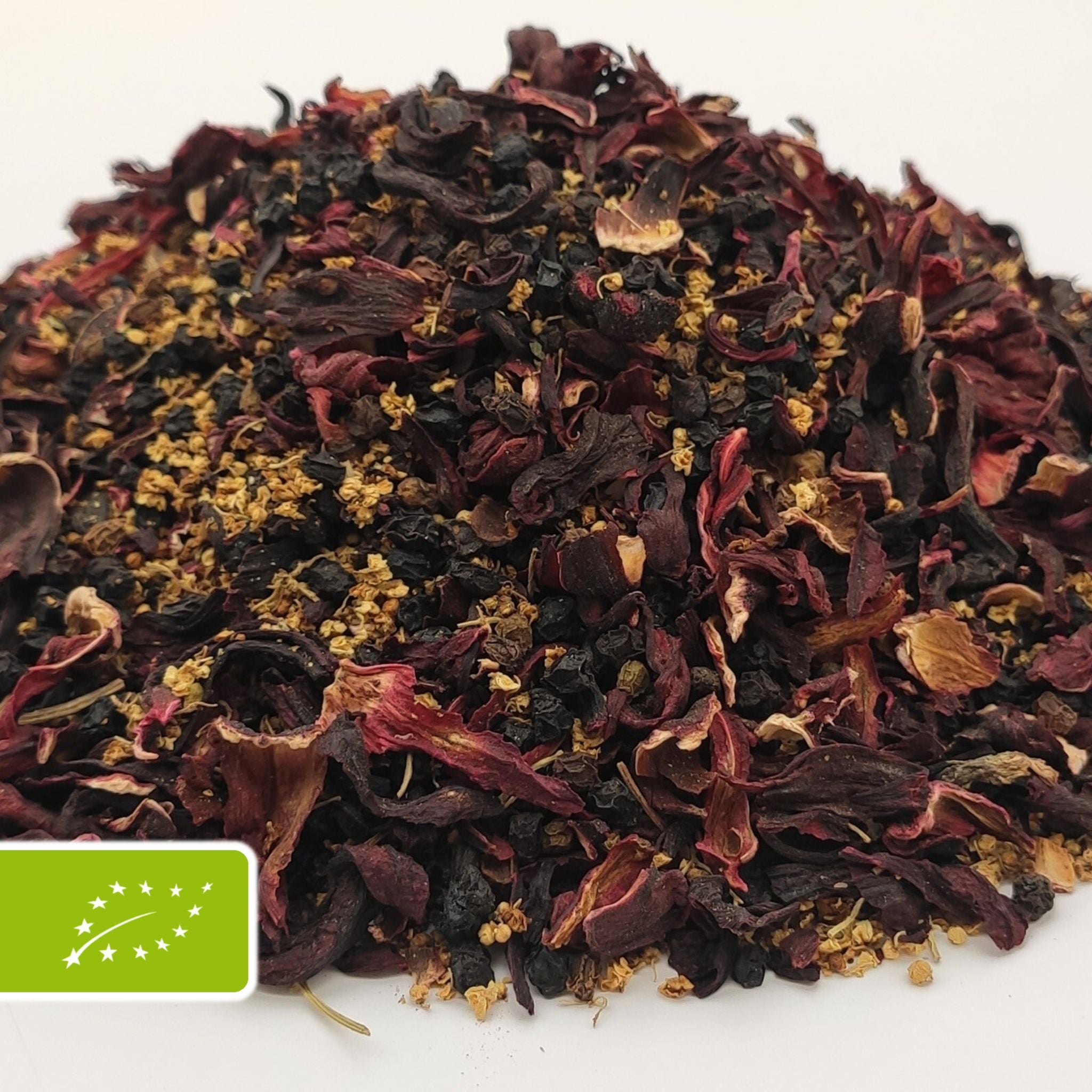 Zutaten: Echte Karkade* (40%), Holunderblüten* (30%), Holunderbeeren* (30%)